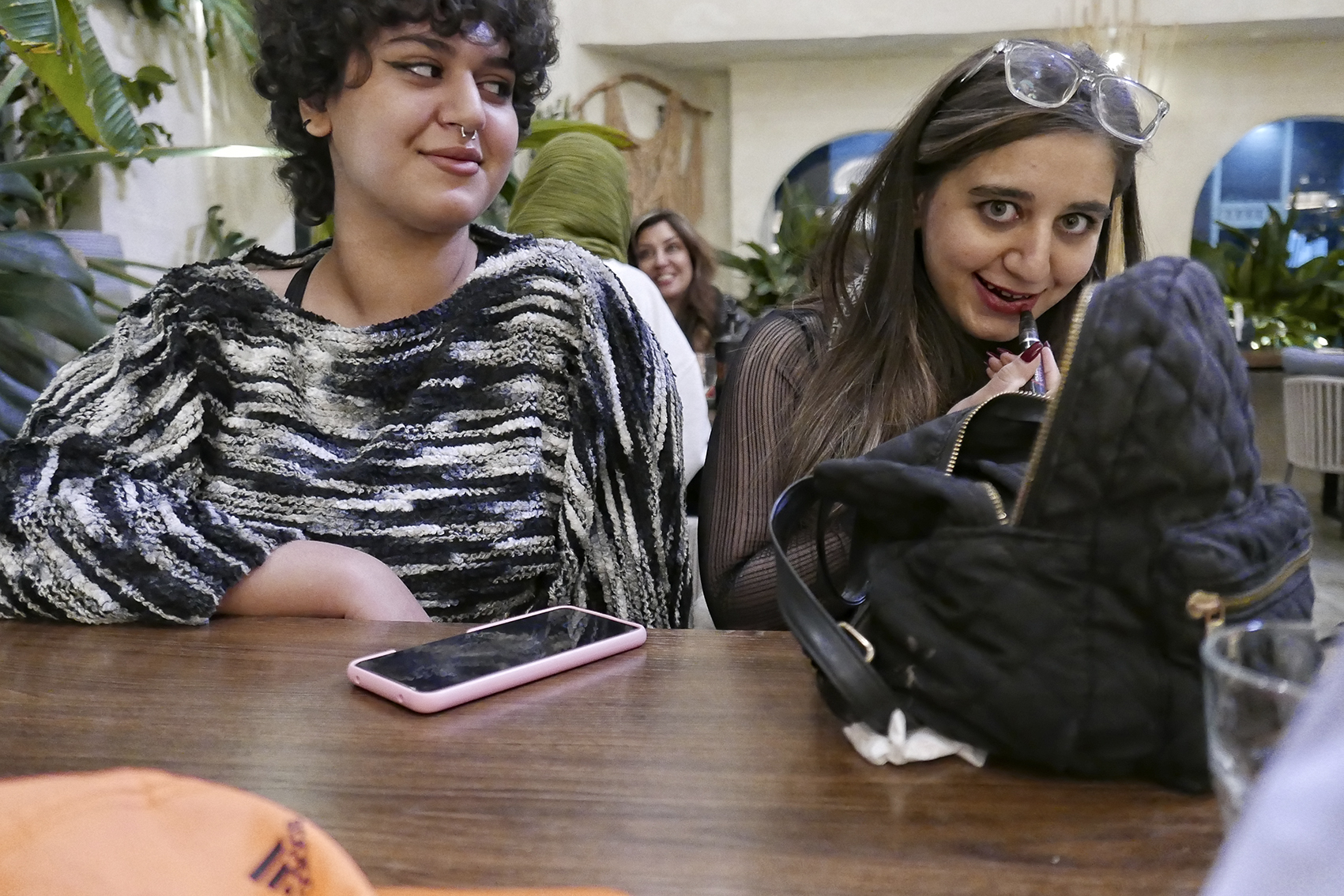 Kuvassa kaksi iranilaista nuorta naista, Kimmo Kirveksen valokuvanäyttelyn esittelykuva