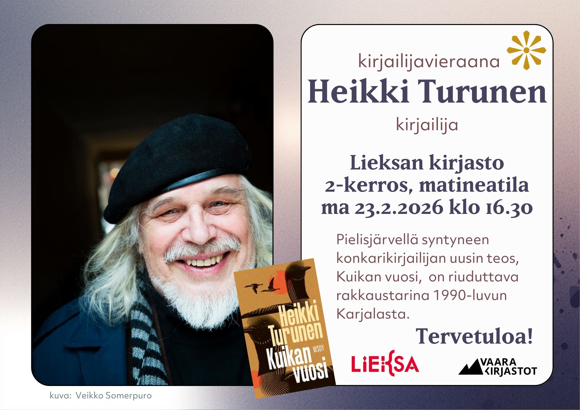 Tekstissä sanotaan kirjailijavieraana Heikki Turunen kirjailija Lieksan kirjasto 2-kerros, matineatila ma 23.2.2026 klo 16.30 Pielisjärvellä syntyneen konkarikirjailijan uusin teos, Kuikan vuosi, on riuduttava rakkaustarina 1990-luvun Karjalasta. Tervetuloa! LiEKSA VAARA KIRJASTOT Kuvituskuvana valokuva Heikki Turusesta sekä hänen romaaninsa Kuikan vuosi kansi.