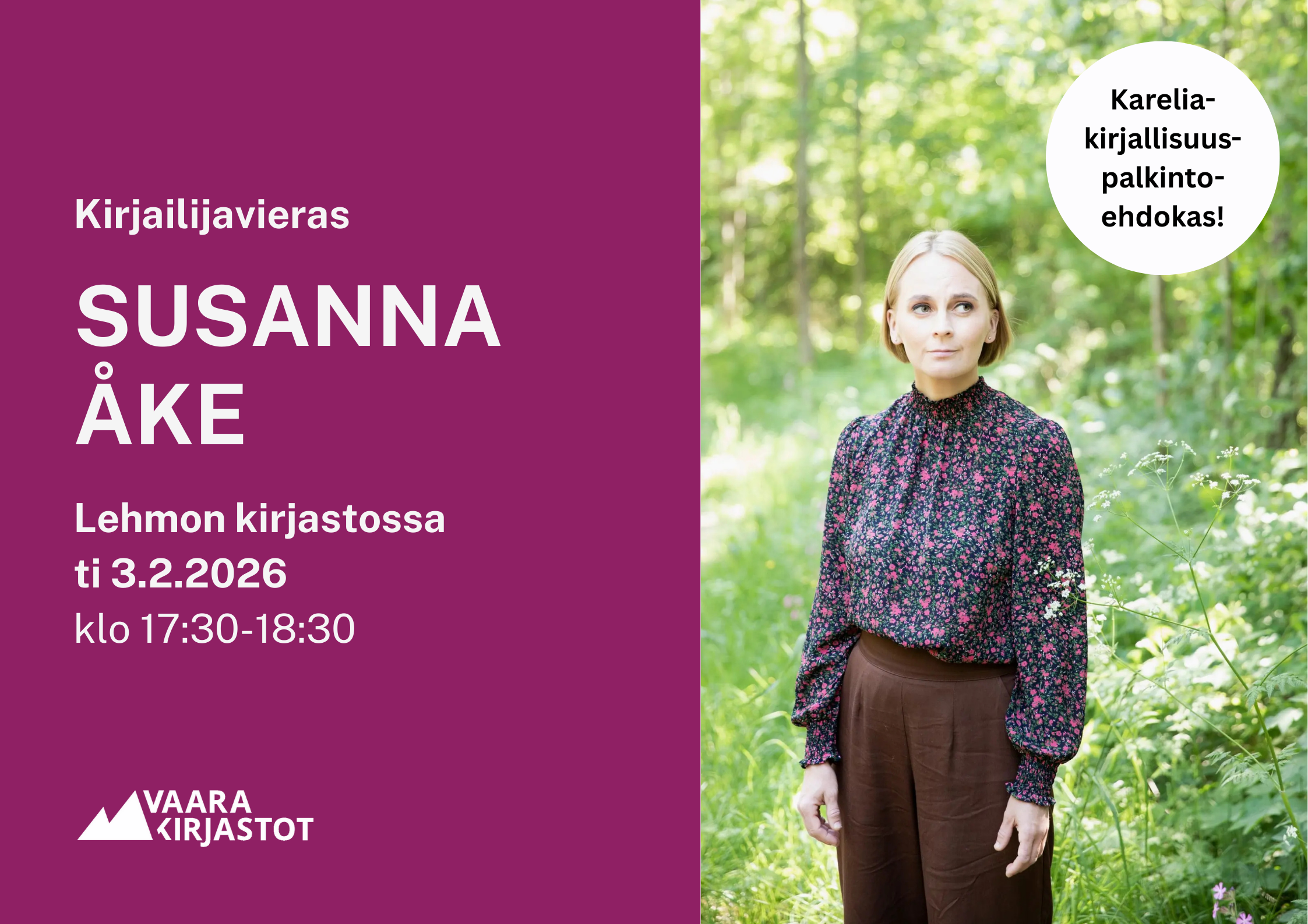 Lehmon kirjaston kirjailijavieraana on tiistaina 3.2. klo 17:30-18:30 Susanna Åke.