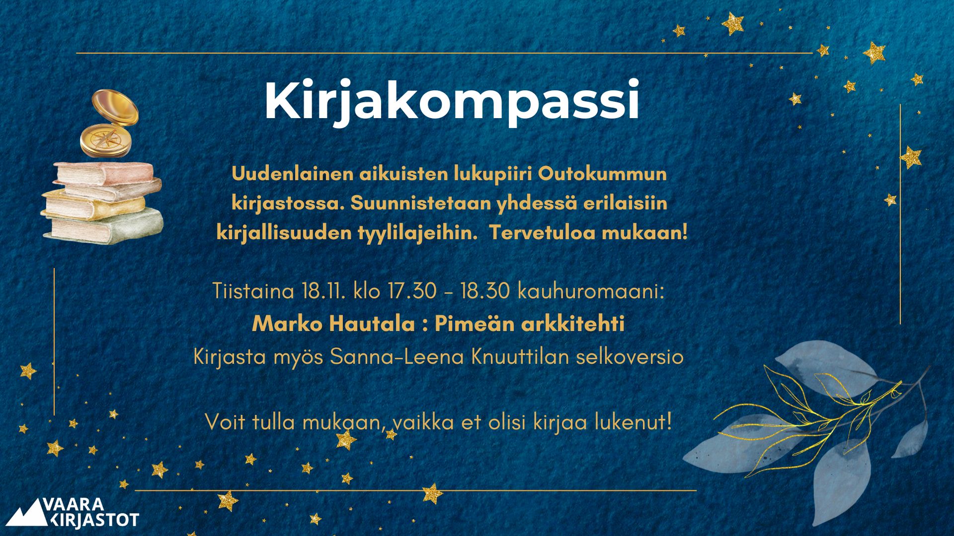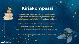 Outokummun kirjaston lukupiiri, jossa suunnistetaan rennolla otteella kirjallisuuden erilaisiin tyylilajeihin. Kevätkaudelle voi esittää omia toiveita luettavista kirjoista/tyylilajeista. Marraskuussa vuorossa kauhuromaani: