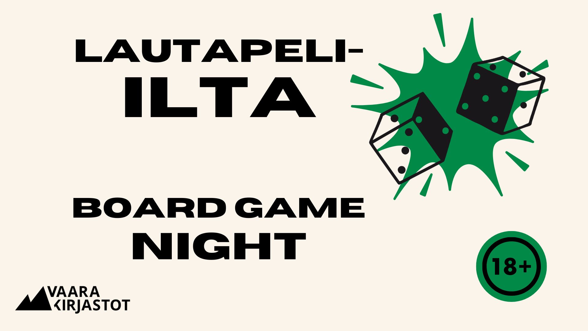 Everyone can come to Board game night, but games are usually suitable for over 15-year-old players. There will be some snacks and drinks. You can bring your own game with you or tell your wish for the next night. Yay – see you soon!