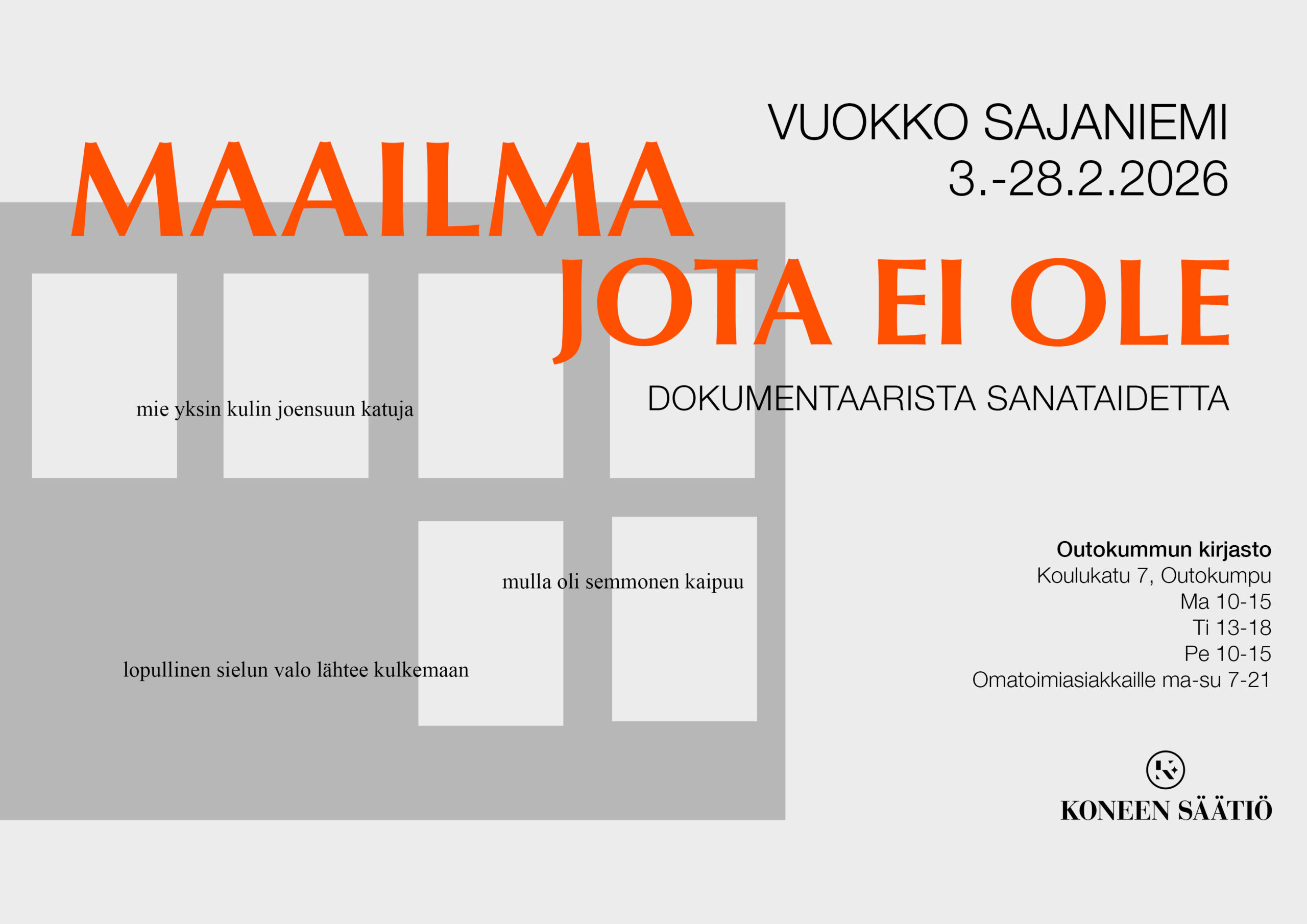 Helmikuussa Outokummun kirjaston galleriassa on esillä Vuokko Sajaniemen teksti-installaatio Maailma jota ei ole.