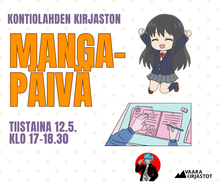 Tervetuloa tutustumaan japanilaiseen sarjakuvaan, animaatioon ja muuhun populaarikulttuuriin Kontiolahden kirjaston mangapäivässä tiistaina 12.5. klo 17-18.30. Luvassa on monenlaista ohjelmaa: