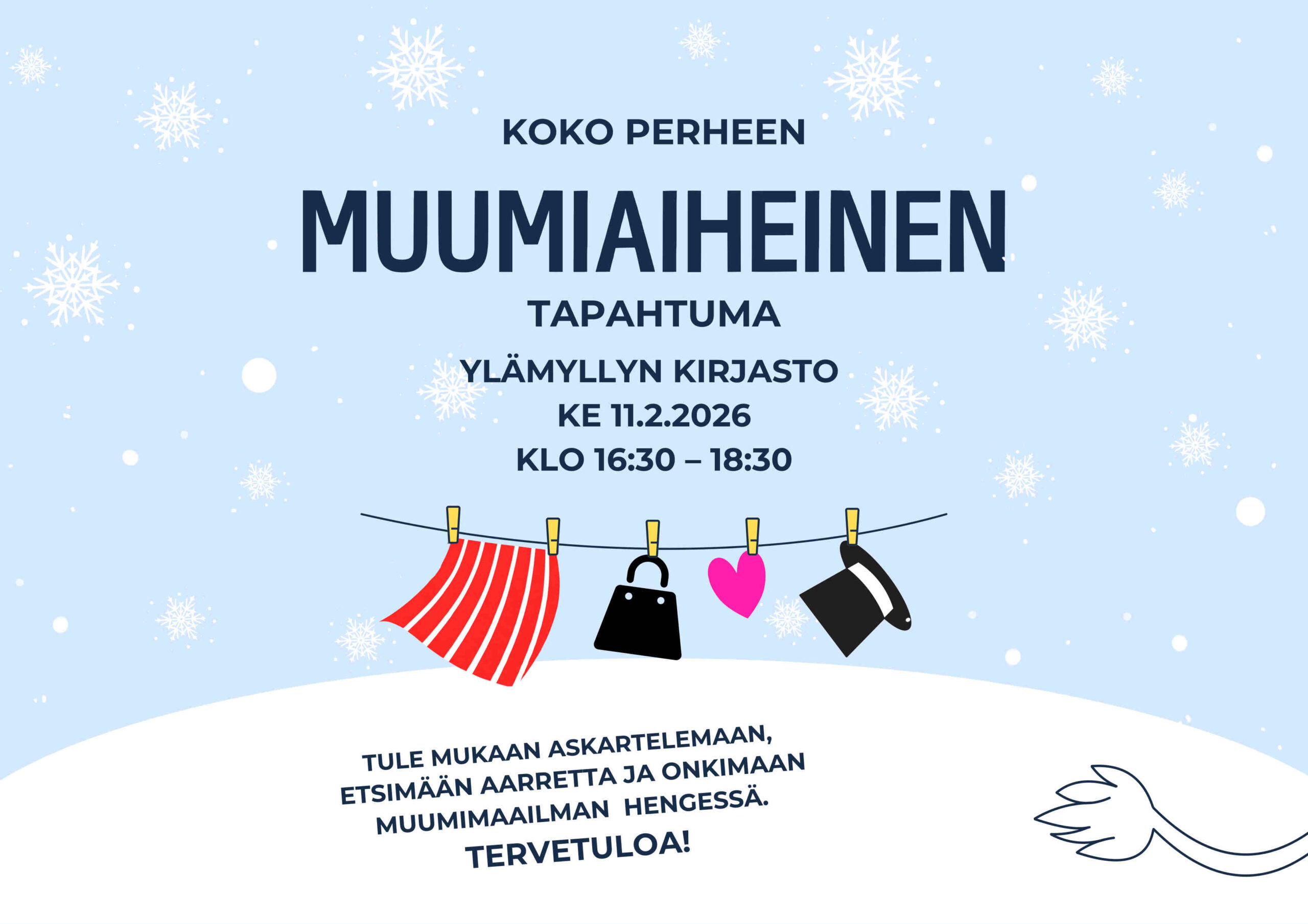 Ylämyllyn kirjastossa ke 11.2.2026 klo 16:30–18:30 järjestetään koko perheen muumiaiheinen tapahtuma!
