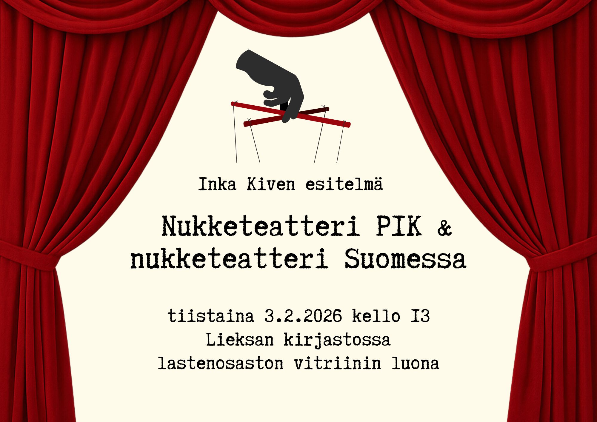 Inka Kiven esitelmä Nukketeatteri PIK & nukketeatteri Suomessa tiistaina 3.2.2026 kello 13 Lieksan kirjastossa lastenosaston vitriinin luona.Kuvituskuvana piirroskuva esiripusta sekä kuva kädestä jossa on nukketeatterinuken narut.