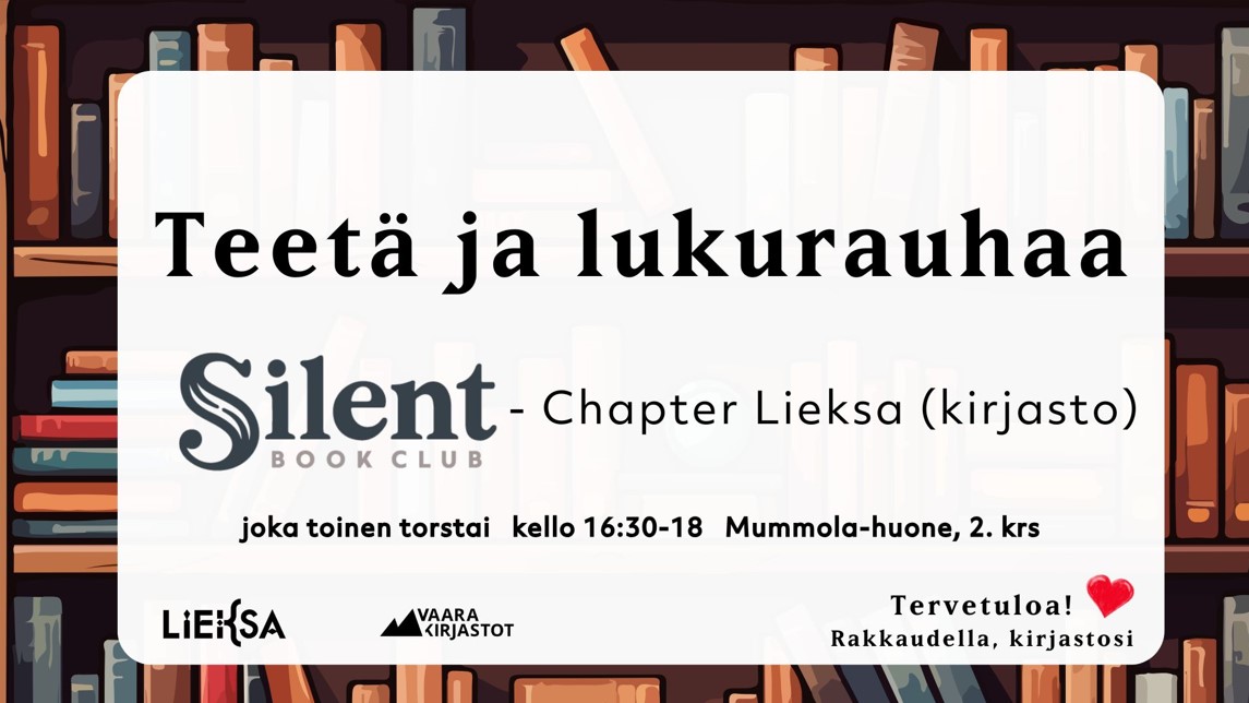 Teksti: "Teetä ja lukurauhaa - Silent Book Club chapter Lieksa. joka toinen torstai kello 16:30-18 Mummola-huone, 2. krs. Tervetuloa! Rakkaudella, kirjastosi." Kuvituskuvana piirroskuva kirjahyllystä. Tapahtuman tiedot löytyvät julkaisusta.